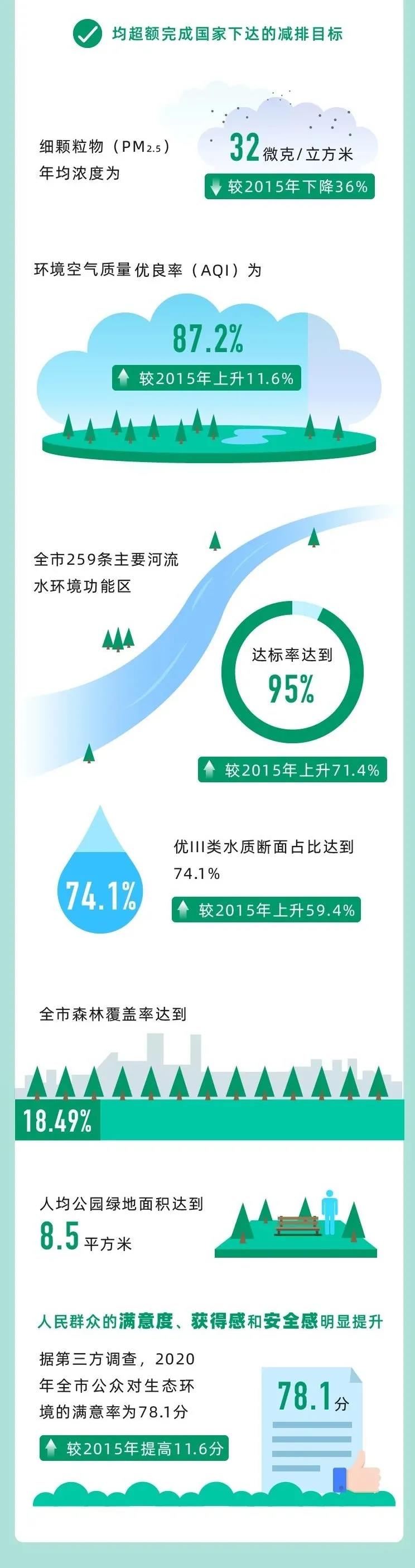 一是生态环境质量明显改善。在全市人口、经济、能源消费总量保持增长的同时,主要污染物排放总量持续下降,生态环境质量持续改善。2020年,经初步核定,全市化学需氧量、氨氮、二氧化硫和氮氧化物等4项主要污染物排放量分别较2015年削减68.1%、38.1%、46.6%和28.2%,均超额完成国家下达的减排目标。细颗粒物(PM2.5)年均浓度为32微克/立方米,较2015年下降36%;环境空气质量优良率(AQI)为87.2%,较2015年上升11.6个百分点。全市259条主要河流断面水环境功能区达标率为95%,较2015年上升71.4个百分点;优III类水质断面占比达74.1%,较2015年上升59.4个百分点。森林覆盖率达到18.49%,人均公园绿地面积达到8.5平方米。人民群众的满意度、获得感和安全感明显提升。据第三方调查,2020年公众对生态环境的满意率为78.1分,较2015年提高11.6分。