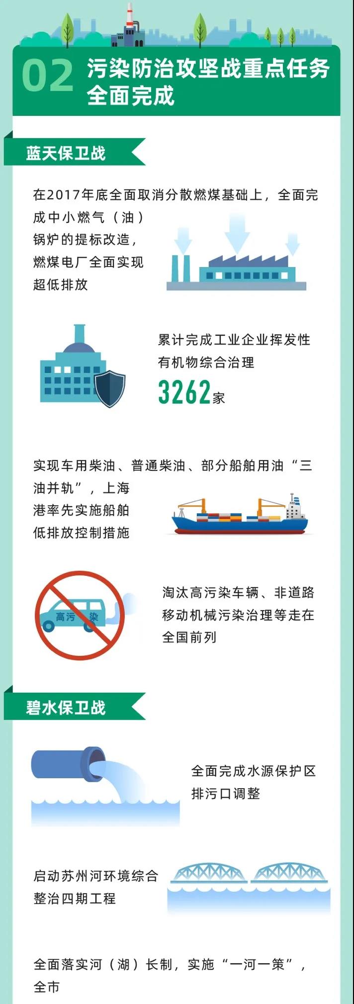 二是污染防治攻坚战重点任务全面完成。蓝天保卫战方面,在2017年底全面取消分散燃煤基础上,全面完成中小燃气(油)锅炉的提标改造,燃煤电厂全面实现超低排放;累计完成工业企业挥发性有机物综合治理3262家;实现车用柴油、普通柴油、部分船舶用油“三油并轨”,上海港率先实施船舶低排放控制措施;淘汰高污染车辆、非道路移动机械污染治理等走在全国前列。碧水保卫战方面,全面完成水源保护区排污口调整;启动苏州河环境综合整治四期工程;全面落实河(湖)长制,实施“一河一策”,3158条段河道2018年底全面消除黑臭,4.73万个河湖2020年底基本消除劣V类。净土保卫战方面,完成农用地土壤详查和类别划定工作,在全国率先完成重点企业用地基础信息调查,发布《上海市建设用地土壤污染风险管控和修复名录》,完成南大、桃浦等重点区域土壤修复试点。垃圾分类攻坚战方面,在全国率先出台实施《生活垃圾管理条例》地方性法规,推动垃圾分类成为社会新时尚,取得超预期成效。