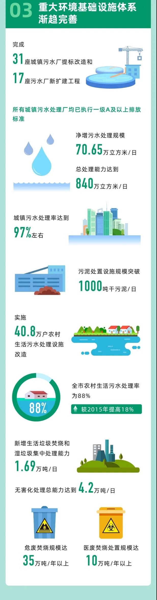 三是重大环境基础设施体系渐趋完善。完成31座城镇污水厂提标改造和17座污水厂新扩建工程,所有城镇污水处理厂均已执行一级A及以上排放标准,净增污水处理规模70.65万立方米/日,总处理能力达到840万立方米/日,城镇污水处理率预计97%左右,污泥处置设施规模突破1000吨干污泥/日。实施40.8万户农村生活污水处理设施改造,农村生活污水处理率为88%,较2015年提高18个百分点。新增生活垃圾焚烧和湿垃圾集中处理能力1.69万吨/日,无害化处理总能力达到4.2万吨/日,危废焚烧规模达35万吨/年以上,医废焚烧处置规模达10万吨/年以上。