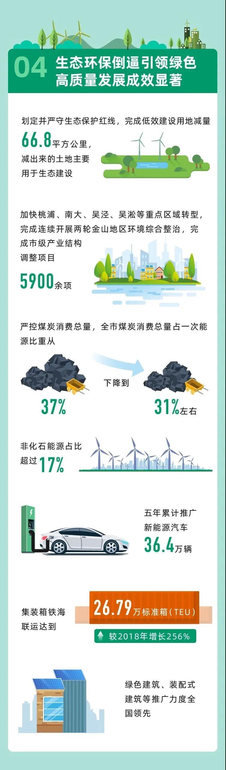 四是生态环保倒逼引领绿色高质量发展成效显著。划定并严守生态保护红线,完成低效建设用地减量66.8平方公里,减出来的土地主要用于生态建设。坚持“四个论英雄”的发展导向,加快桃浦、南大、吴泾、吴淞等重点区域转型,完成两轮金山地区环境综合整治,完成市级产业结构调整项目5900余项。严控煤炭消费总量,全市煤炭消费总量占一次能源比重从37%下降到31%左右,非化石能源占比超过17%。累计推广新能源汽车36.4万辆,集装箱铁海联运达到26.79万标准箱,较2018年增长256%。绿色建筑、装配式建筑推广力度全国领先。