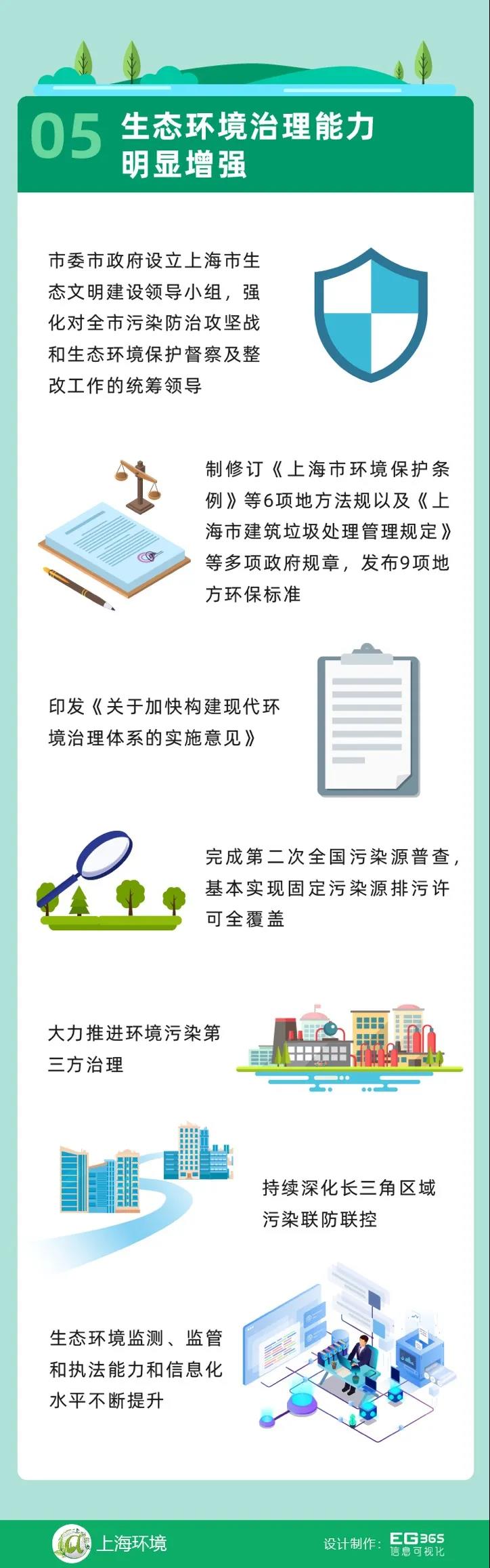 五是生态环境治理能力明显增强。市委市政府设立上海市生态文明建设领导小组,强化对全市污染防治攻坚战和生态环境保护督察及整改工作的统筹领导,生态环境保护“党政同责、一岗双责”机制及相应考核问责体系不断健全完善。制修订《上海市环境保护条例》等6项地方法规以及《上海市建筑垃圾处理管理规定》等多项政府规章,发布9项地方环保标准。印发《关于加快构建现代环境治理体系的实施意见》,完成第二次全国污染源普查,基本实现固定污染源排污许可全覆盖,大力推进环境污染第三方治理,持续深化长三角区域污染联防联控,生态环境监测、监管和执法能力和信息化水平持续提升。