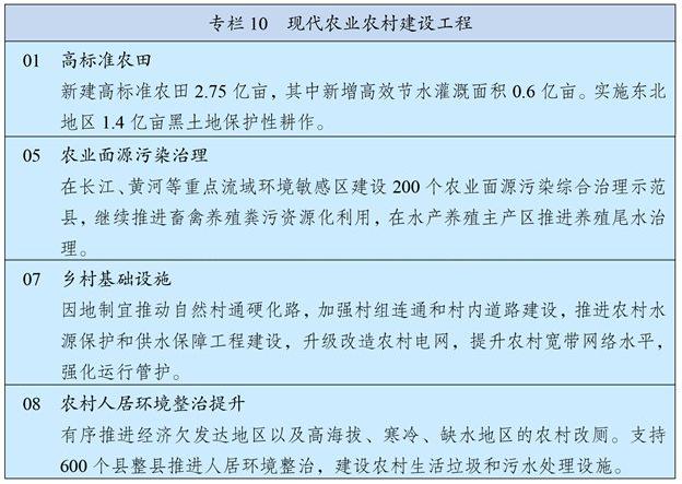 夯实粮食生产能力基础,保障粮、棉、油、糖、肉、奶等重要农产品供给安全。坚持最严格的耕地保护制度,强化耕地数量保护和质量提升,严守18亿亩耕地红线,遏制耕地“非农化”、防止“非粮化”,规范耕地占补平衡,严禁占优补劣、占水田补旱地。以粮食生产功能区和重要农产品生产保护区为重点,建设国家粮食安全产业带,实施高标准农田建设工程,建成10.75亿亩集中连片高标准农田。实施黑土地保护工程,加强东北黑土地保护和地力恢复。