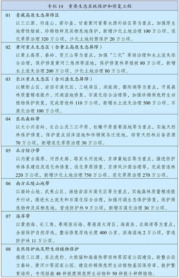 强化国土空间规划和用途管控,划定落实生态保护红线、永久基本农田、城镇开发边界以及各类海域保护线。以国家重点生态功能区、生态保护红线、国家级自然保护地等为重点,实施重要生态系统保护和修复重大工程,加快推进青藏高原生态屏障区、黄河重点生态区、长江重点生态区和东北森林带、北方防沙带、南方丘陵山地带、海岸带等生态屏障建设。加强长江、黄河等大江大河和重要湖泊湿地生态保护治理,加强重要生态廊道建设和保护。全面加强天然林和湿地保护,湿地保护率提高到55%。科学推进水土流失和荒漠化、石漠化综合治理,开展大规模国土绿化行动,推行林长制。科学开展人工影响天气活动。推行草原森林河流湖泊休养生息,健全耕地休耕轮作制度,巩固退耕还林还草、退田还湖还湿、退围还滩还海成果。