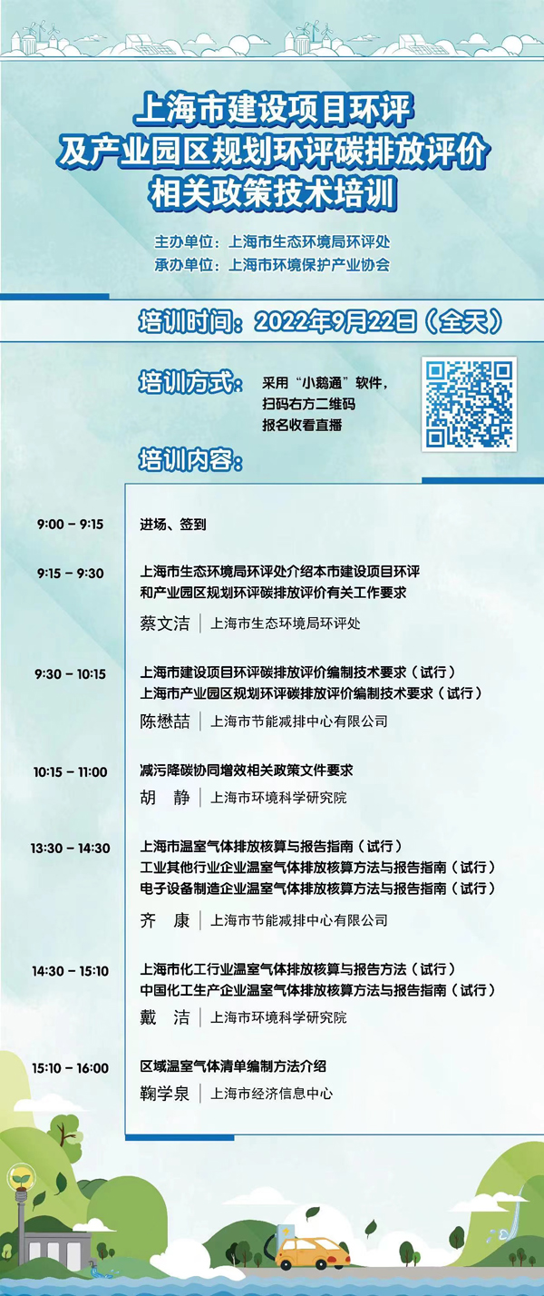 为贯彻落实碳达峰、碳中和的重大战略决策,推动污染物和碳排放环境影响评价管理统筹融合,促进减污降碳协同增效,由上海市生态环境局环评处主办、388vip太阳集团承办的“上海市建设项目环评及产业园区规划环评碳排放评价相关政策技术培训”即将开班。