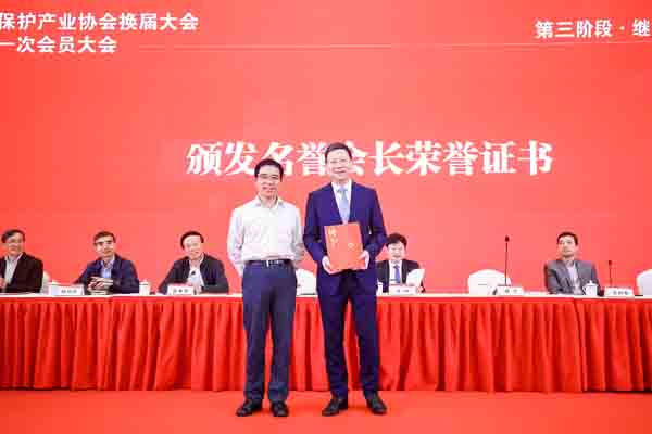 市生态环境局党组书记唐家富向上届理事会会长、上海实业(集团)有限公司总裁周军颁发了名誉会长荣誉证书。周军回顾了任期内主要工作,并就环境保护行业的发展谈了自己的想法。苏国栋会长发表了当选感言,他表示,将与协会一起继续践行服务企业、服务行业、服务政府、服务社会的宗旨,把握新时代、新形势、新要求,紧紧依靠会员单位的大力支持,接续努力、团结奋斗,不断把协会的各项工作推向前进。