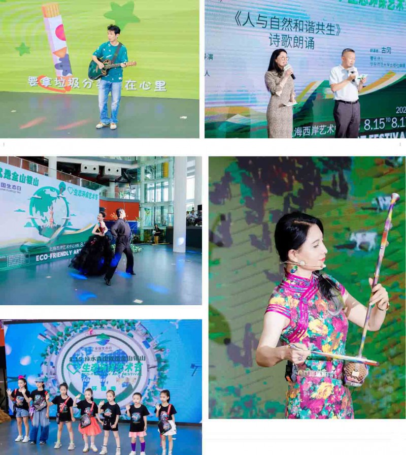 开幕式精彩展现融合丰富生态环保元素的海派文化,音乐人王渊超带来了他创作的上海童谣《垃圾分类再垃圾倒》,呼吁从全社会从娃娃做起做好垃圾分类;国家一级演员马晓辉演奏了二胡曲《万马奔腾》,在琴弦拨动间诠释生物之灵;环保艺术节总策划、总导演王力与诗人古冈联袂朗诵《人与自然和谐共生》,用中国哲学语言表达真善美的追求;两位舞者身穿碎步边角料制作的服装,展现了海派华尔兹舞的经典之美;艺术家叶青、超模刘星岐和潮童星的孩子们一起带来了一场充满创意的生态环保服装秀……