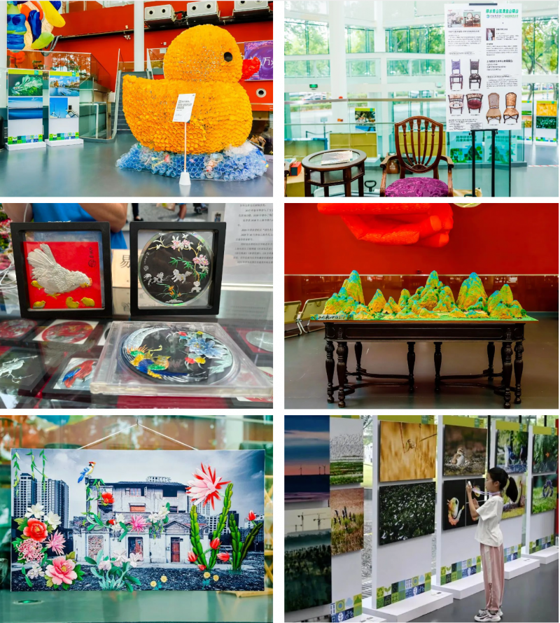 在主展厅中,上海市环境保护宣传教育中心带来了“建设人与自然和谐共生的现代化”主题摄影展;袁隆、宋陈、王力、夏德初等环保艺术家精心布置了《小黄鸭》《行走的山水》《“变废为宝”家具设计系列作品》《易拉罐画》等环保装置艺术作品;奚溪制作了山水林田湖草沙主题的蛋糕艺术作品,吸引了广大观众的驻足观赏和品味。