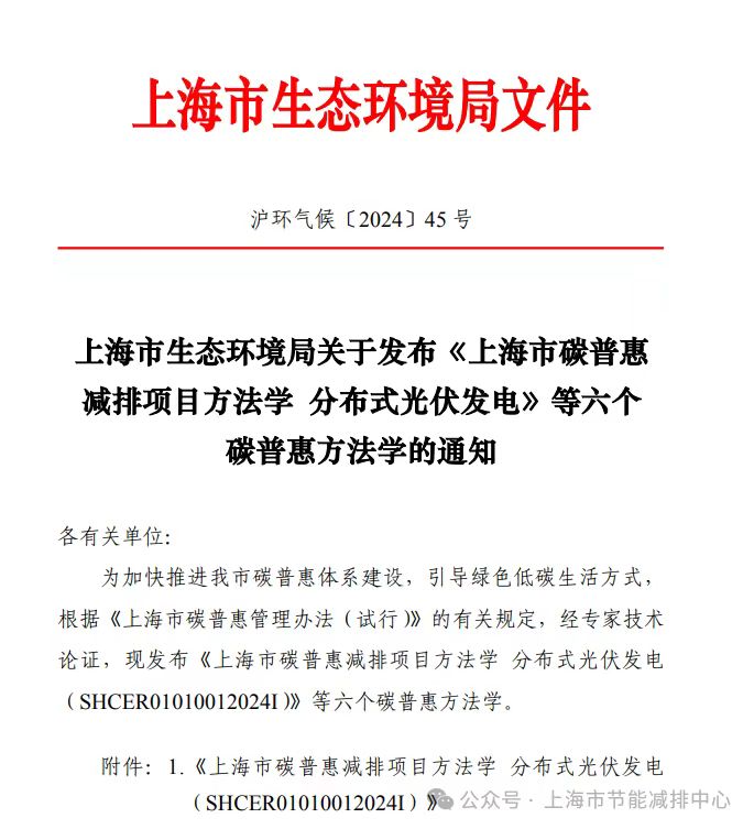 为加快推进我市碳普惠体系建设,引导绿色低碳生活方式。2024年3月13日,上海市生态环境局正式发布了《上海市碳普惠减排项目方法学 分布式光伏发电》等六个碳普惠方法学。