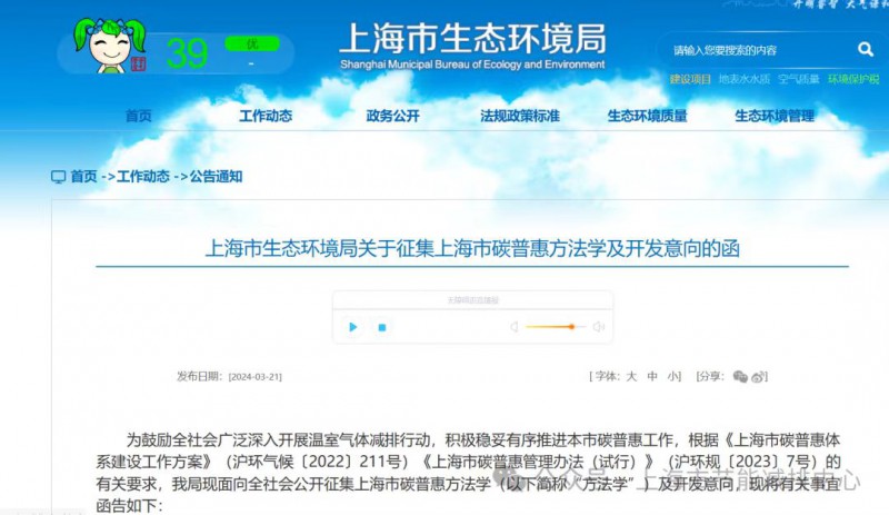 2024年3月21日,市生态环境局发布了《关于征集上海市碳普惠方法学及开发意向的通知》,目的为鼓励全社会广泛深入开展温室气体减排行动。