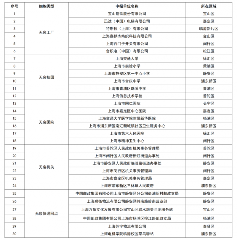 根据《上海市“无废细胞”建设评估管理规程(试行)》《上海市“无废细胞”建设评估细则(2023版)》(沪生建办〔2023〕14号)要求,经各区“无废城市”建设工作领导小组推荐、市行业主管部门综合评估,共评出市级“无废细胞”30个,现予以公布。