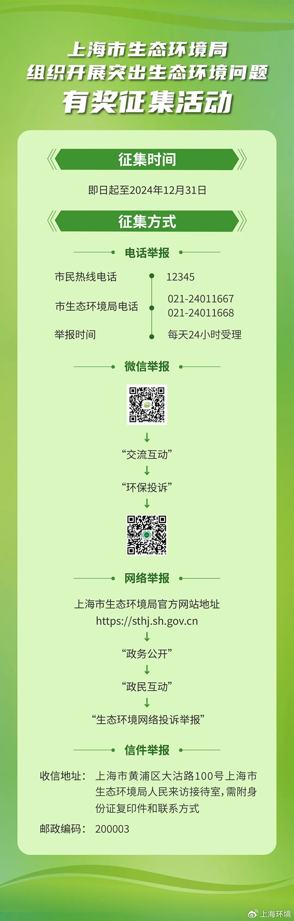 ◆ 信件举报,市民可通过写信方式提供突出生态环境问题线索,收信地址为上海市黄浦区大沽路100号上海市生态环境局人民来访接待室,邮编为200003,需附身份证复印件和联系方式。