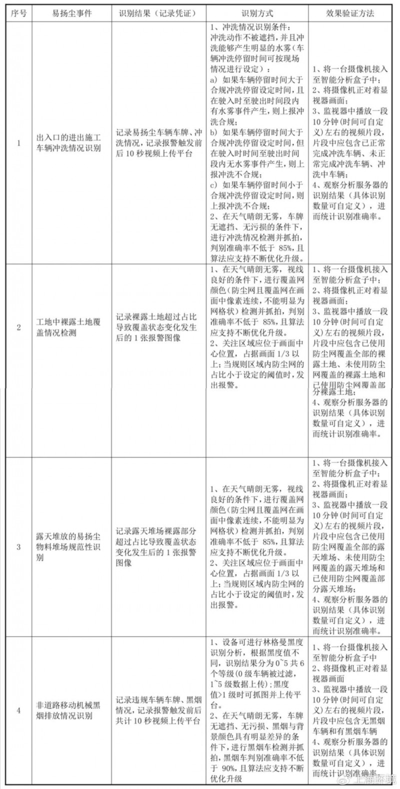 6.12 支持一机多用,提高现场设备的利用率和集成度,可以综合利用各个行业主管部门要求加装的满足本技术规范相关要求的视频监控设备,通过符合功能需求并完成效果验证的智能分析模块开展扬尘视频监控工作,智能分析模块形成的分析成果(视频、图片、记录等信息)可主动推送至市监控平台。