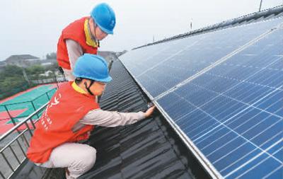 在浙江省德清县新安镇舍西村,工作人员在检查村民屋顶太阳能光伏板并网发电情况。 新华社记者 徐 昱摄