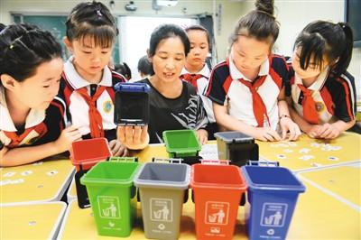 河北省邯郸市广平县明德小学的学生在模拟垃圾分类。程学虎摄(人民图片)