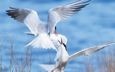 两只须浮鸥在山东省青岛市城阳区红岛街道一处沿海湿地追逐嬉戏。王海滨摄(人民图片)