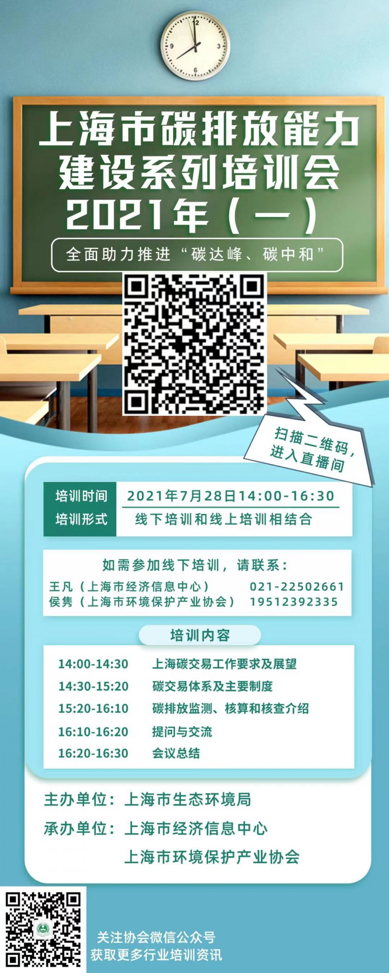 2021年第一期培训将于2021年7月28日下午举行。培训会将采用线下和线上相结合的培训方式,主要针对《上海碳交易工作要求及展望》、《碳交易体系及主要制度》和《碳排放监测、核算和核查介绍》等内容进行深入透彻的讲解和培训。扫描二维码可直接参与线上培训。