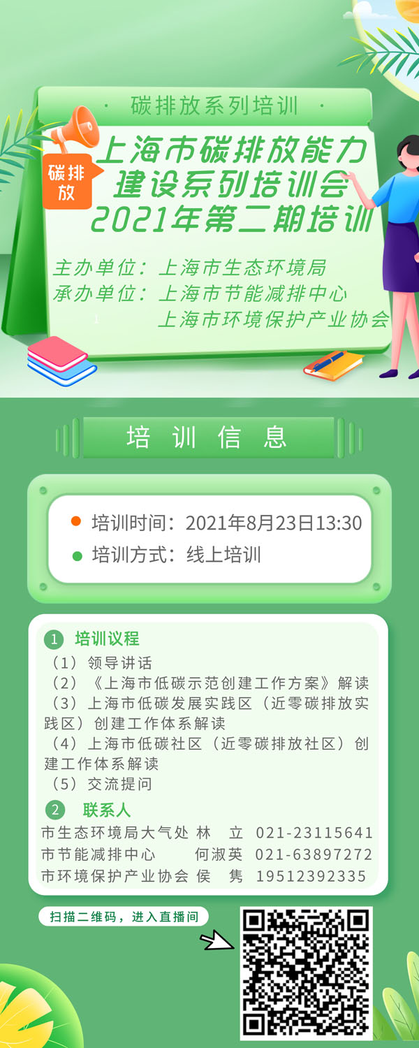 为了全面贯彻落实党中央作出的碳达峰、碳中和目标要求,引领倡导全社会绿色低碳转型,积极推进本市“十四五”期间低碳示范创建工作,上海市碳排放能力建设系列培训2021年第二期将于2021年8月23日下午举行。本次培训由上海市生态环境局主办,上海市节能减排中心和388vip太阳集团承办。