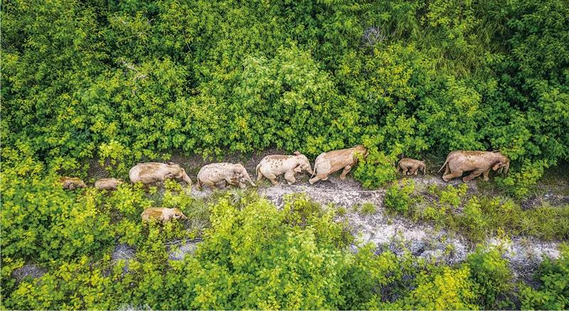 原本栖息在云南省西双版纳傣族自治州境内的一群野生亚洲象北上及返回之旅,引发全球关注。中国政府与民众携手护象的行动得到世界点赞。图为2021年8月9日在云南省玉溪市元江县境内拍摄的象群(无人机照片)。 新华社记者 胡超/摄