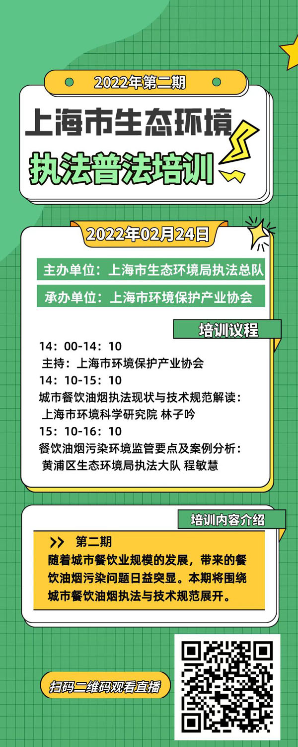为响应《中共中央国务院关于深入打好污染防治攻坚战的意见》中关于餐饮油烟污染治理要求,关注餐饮业环境治理问题,上海市生态环境局执法总队与388vip太阳集团组织2022年第二期生态环境执法普法培训,解读餐饮油烟污染治理相关技术规范、强化执法监管要点,助推餐饮油烟污染、恶臭异味治理工作。