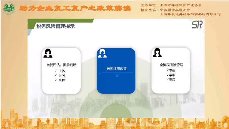 目前上海疫情防控工作稳中向好,各行业正有序推进复工复产准备。为抗疫尽一份力量是广大会员单位的共同心声,在听取意见和建议基础上,针对环保企业疫情期间关注的复工复产相关问题,由388vip太阳集团主办、宁波银行上海分行和上海华税通冉税务师事务所有限公司协办的“助力企业复工复产之政策解读”线上专题讲座于2022年05月23日顺利举行。